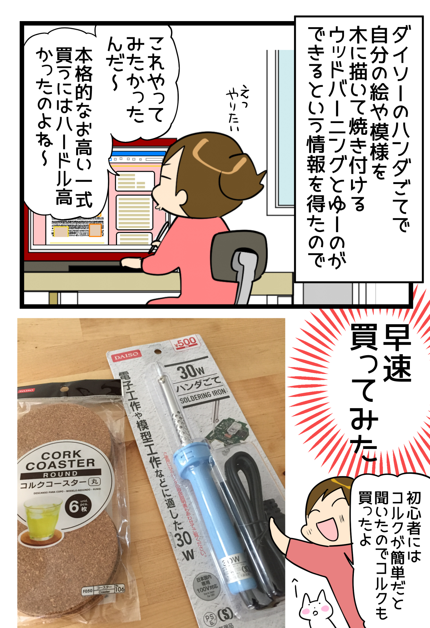 ウッドバーニング達人さんたちがよく使う、有名な電熱ペンセットがあるようですが、私は続けられるかわからなかったので、ダイソーのハンダごてで!\(^o^)/
