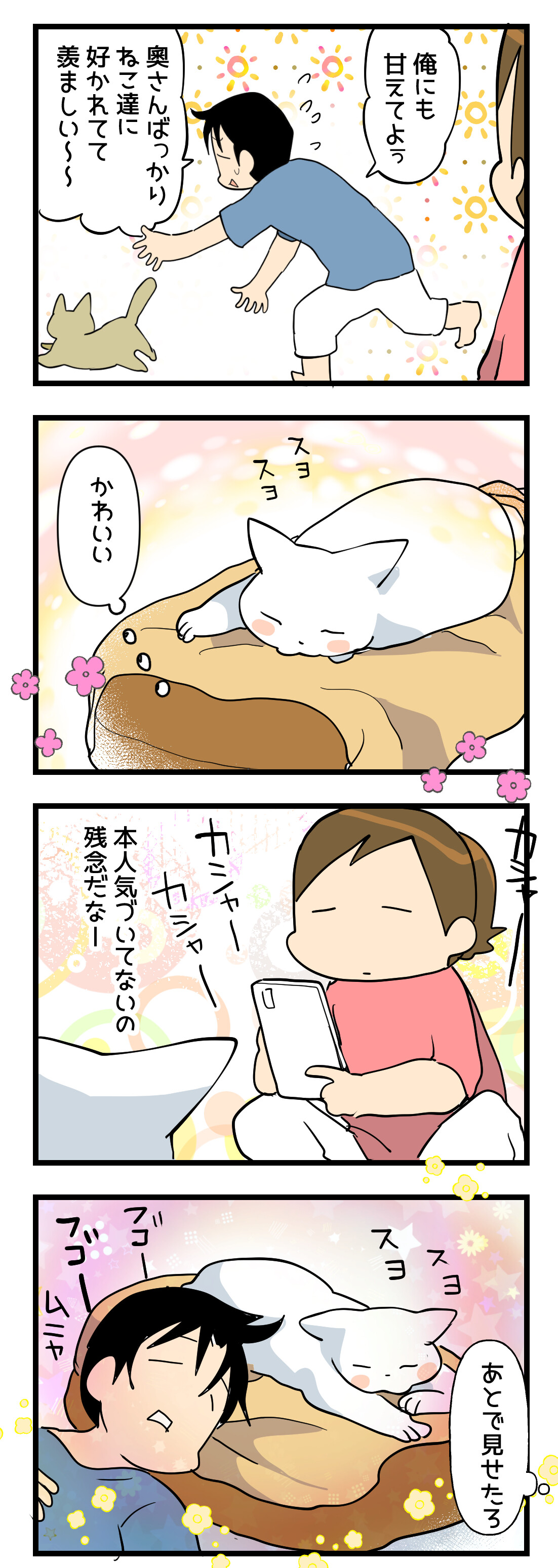 無意識にクッション譲った上に足蹴にされてるけど気づいてない幸せな旦那氏。