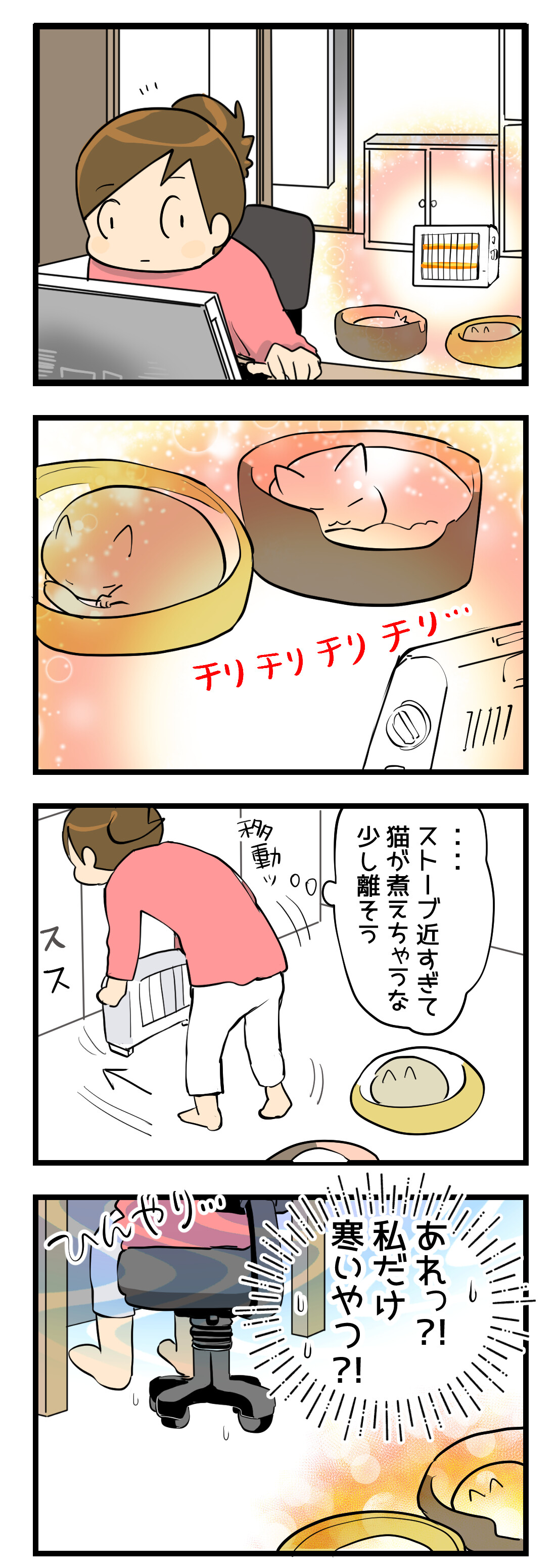 人が管理できる時はエアコン暖房より、直接チリチリ(笑)できるヒーターの方が好きみたいです。