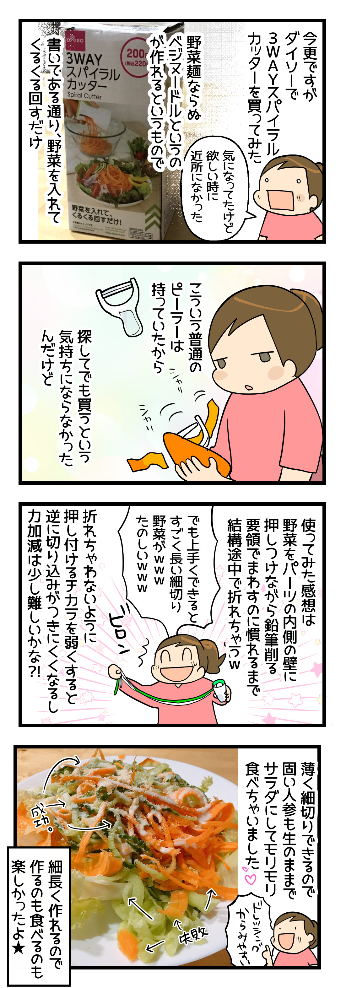 ↓話題のベジヌードル用のこういうのが欲しいけど、実際飽きっぽい自分が元取れるだけ使うかどうかがわからないからハードルが高いって人がお試しするには、この値段で買えるのは最高だと思います( ´∀` )<刃の切れ味はお値段そうおだと思います。ダイソーなら税込み220円。